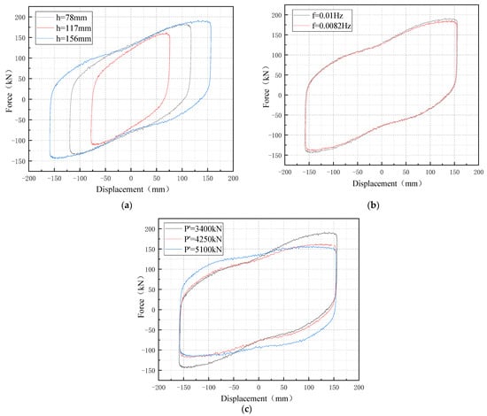 It can be concluded from Figure 9a–c that (1) horizontal stiffness of the three-dimensional support enhances the growth of shear displacement, and it could be displayed from the diagram that the effect of shear displacement on the horizontal stiffness value of the three-dimensional bearing is very remarkable. (2) The horizontal stiffness of the three-dimensional bearing is enhanced with the growth of loading frequency. Due to the small difference in loading frequency selected for this experiment, the horizontal stiffness variation reflected in the final figure is not very significant. (3) The horizontal stiffness of the three-dimensional bearing reduces little by little with the enhancement of axial pressure, indicating that an increase in axial pressure has a remarkable effect on the horizontal stiffness of the three-dimensional bearing.