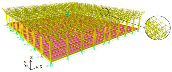 The roof of the large-span [] foundation isolation structure is an orthogonal rectangular pyramid steel grid structure; the plane size is 90 m × 90 m, the height is 5.17 m, and the mesh size is 10 m × 10 m. The bottom part is a one-story reinforced concrete frame structure, 10 m high, supported by peripheral columns; the section size of peripheral columns is 1.5 m × 1.5 m. The main beam is 0.8 m × 0.4 m, the secondary beam is 0.4 m × 0.2 m, and the beam plate and column are reinforced according to the requirements of the code. The top chord layer of the truss roof is subject to a uniform constant load of 0.55 kN/m2 and live load of 0.5 kN/m2; the bottom chord layer is subject to a uniform constant load of 0.30 kN/m2 and live load of 0.30 kN/m2. The steel is Q345, and the concrete is C40. Seismic fortification intensity is 7 degrees, the design basic seismic acceleration is 0.3 g, and the earthquake group is the second group. In SAP2000, the linking unit is used to simulate rubber isolators. After defining the bearing properties, input the experimental values of the bearing stiffness ratio and damping ratio. The supports are distributed around the building model, and there is no mixed use of other types of supports. The stiffness and damping parameters of the support are derived from the test data. According to the stress ratio and axial compression ratio of the structure, the distribution of the support is determined. Its 3D finite element model is displayed in Figure 10.