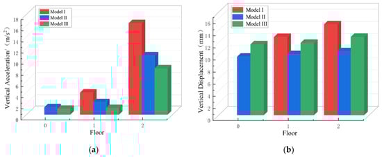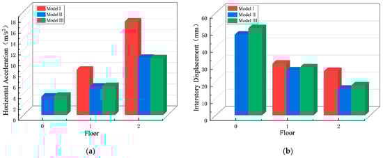 Figure 13a shows the horizontal absolute acceleration response of different model structures. It can be concluded that (1) the horizontal acceleration of the structure enhances with the increase of floors; (2) compared with the above three model structures, we can conclude that they have very similar seismic reduction effects, which are in line with the horizontal structural design characteristics of the support; but after calculation, the horizontal energy consumption of Model III is 7.2% higher than that of Model II.