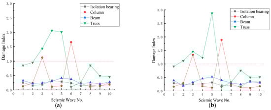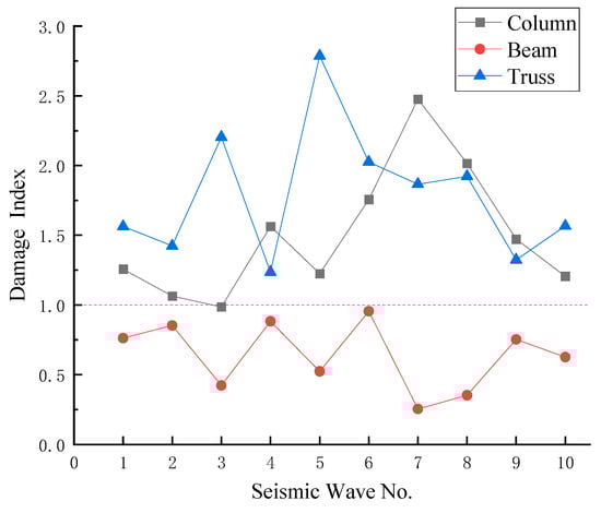 From Figure 14, it can be seen that under the action of 10 seismic waves (large earthquakes) of 220 gal, the damage to each component of the non-isolated structure is significant. The damage to trusses and columns is generally greater than 1. Although the damage to the beam components is less than 1, it has exceeded 0.65 under most seismic waves, indicating severe damage. The probability of component failure under earthquake action in this case structure is ranked as column ≈ truss > beam.