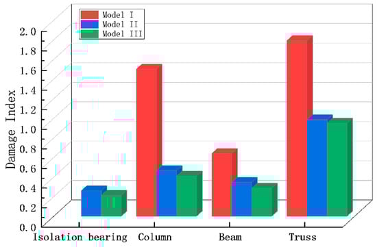 It can be seen from Figure 15 and Figure 16 that (1) under the action of 220 gal seismic waves (large earthquakes), the damage index of the truss layer of the isolation structure will exceed 1 under the action of a few seismic waves; as an important vertically stressed component, the column is greater than 1 only under the action of two groups of seismic waves. In other cases, the damage of the component is less than 1, the value is small, and the component is basically intact. (2) When the intensity of ground motion is large, damage to the upper structure is larger than that of the isolation layer, especially damage to the column and truss. The seismic failure probability of structural members is ranked as truss > column > beam > isolation bearing. (3) Compared with the non-isolated structure, the average damage index of column, beam, and truss layer of Model III after isolation under action of 10 groups of seismic waves decreased by 72.84%, 55.36%, and 47.08%, respectively. The damage index of the column, beam, and truss layer of Model II decreased by 69.07%, 45.94%, and 45.12%, respectively, compared with that of the non-isolated structure. This indicates that the seismic performance of large-span structures has been tremendously improved after earthquake isolation, and Model III is superior.