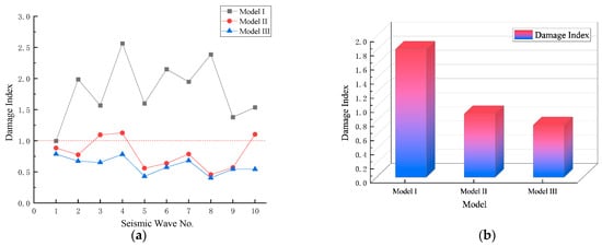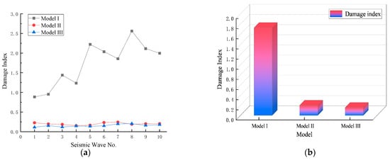 The comparison of structural floor damage between isolated structures and non-isolated structures under action of 10 groups of seismic waves is shown in Figure 17. The average floor damage index of Model I, Model II, and Model III is 1.730373, 0.19894, and 0.15487, respectively.
