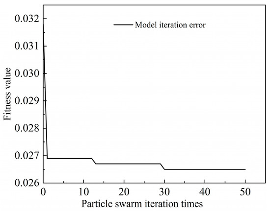 where N is the total number of nodes, I is the number of nodes in the input layer, E is the number of nodes in the output layer, and H is the number of hidden layers. The learning factor represents the update speed of the particles. After testing, it is set to 2 to ensure that the particles conduct both local and global searches in the search space evenly. Considering computer performance and optimization accuracy, the population size is finally determined to be 5, with the maximum and minimum speeds set to 1 and −1, respectively, and the maximum and minimum boundaries set to 2 and −2, respectively. The population is updated for 50 iterations. The iteration times of the PSO-BP neural network are shown in Figure 4. The dataset used for the neural network is also used for the PSO-BP neural network.