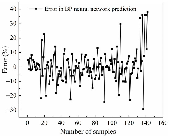 The percentage errors of the BP neural network model’s predictions are depicted in Figure 10.