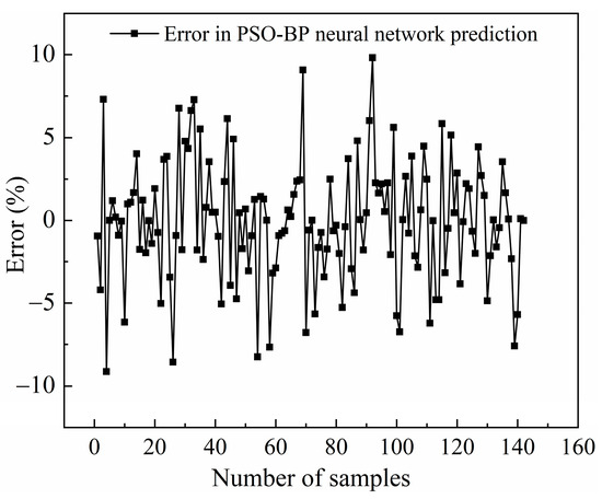 Through an analysis, it was found that the maximum prediction error was 9.82%; no data points had errors exceeding 10%, and the data points with errors exceeding 5% accounted for 16.2% of all data. The calculated MAPE was 2.78%, indicating that the PSO-BP neural network model has good predictive performance and is superior to the BP neural network prediction model.