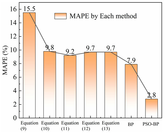 Through an analysis, it was found that the maximum error was 38% and that 31 groups of data had errors greater than 10%, accounting for 22% of the total data. The model was evaluated using the mean absolute percentage error (MAPE), and the calculation formula is shown in Equation (7):