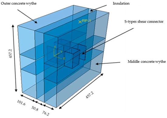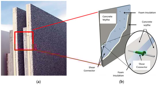 A precast concrete sandwich panel (PCSP) is a composite building material consisting of two layers of concrete and an insulation layer in between, as shown in Figure 1 []. These panels are prefabricated off-site in a controlled environment and transported to the construction site, where they are installed as part of the building envelope. The outer layers of the panel are typically made of high-strength concrete. In contrast, the insulation layer can be made of various materials such as expanded polystyrene foam (EPS), extruded polystyrene foam (XPS), polyurethane foam, or mineral wool []. The insulation layer provides thermal resistance and thus contributes to the overall energy efficiency of the building. PCSPs offer numerous advantages over traditional construction methods []. They can be manufactured in large quantities, reducing construction time and labour costs while ensuring consistent quality with minimal risk of defects or failures. Additionally, PCSPs can be customised to meet specific project requirements and building codes. They can be used in various construction applications, including walls, floors, and roofs []. However, their manufacture and installation require specialised equipment and expertise, which can result in higher initial costs. Still, the thermal performance advantages of PCSPs can result in long-term energy savings, making them a popular choice for both commercial and residential buildings [].