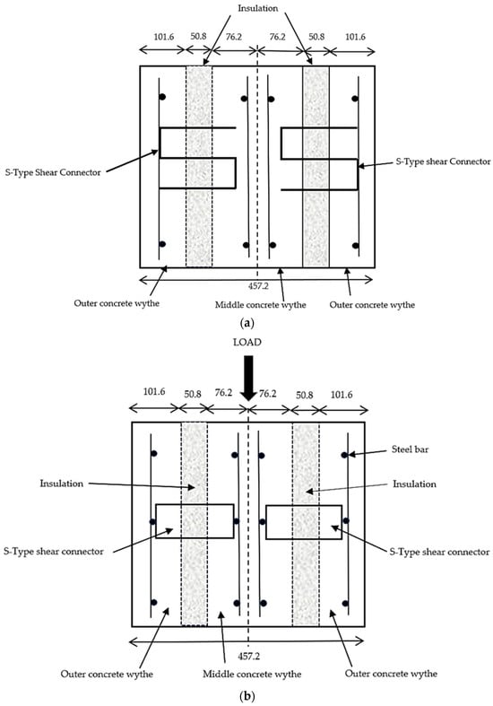 Researchers have been studying the possibility of reducing the thickness of PCSPs to save resources and materials and improve efficiency []. Ensuring the cladding components’ thermal efficiency and structural capabilities minimises panel thickness []. Hence, partial and full composite measures, corrosion protection reinforcement, and shear connections can be viable and effective options. Researchers have determined that a concrete layer must be at least 80 mm thick to sufficiently cover the steel reinforcement in a standard concrete layer []. In a recent study, two concrete panels were attached for composite action in resisting flexural loads []. This design method enhanced the structural capability while facilitating the overall incorporation of a compact composite []. However, it is essential to optimise the shear connections to minimise the impact of thermal transmission, namely thermal bypass, and to improve the structural stiffness [].
