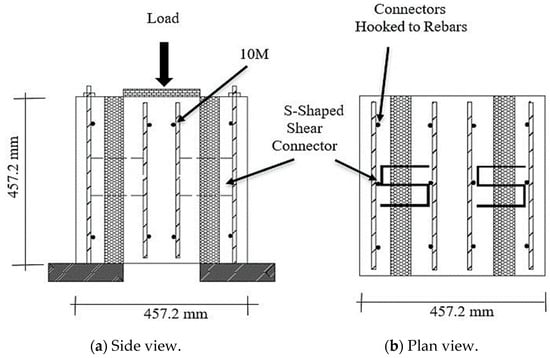 The test specimen comprises three concrete wythes and two XPS foam insulation layers with an area of 457.2 mm × 457.2 mm (length × width). The recommended thickness of each layer is 76.2 mm. However, since a 76.2 mm thick XPS foam is not commercially available, the thickness of the XPS foam layer is altered to 50.8 mm. The thickness of the outer concrete wythes is 101.6 mm, while the middle concrete wall is 152.4 mm thick. Consequently, the combined thickness of all layers is 457.2 mm, resulting in a specimen size of 457.2 mm × 457.2 mm × 457.2 mm, as depicted in Figure 3a,b. The vertical reinforcements in each concrete layer have a 10 mm bar diameter at a precise spacing of 150 mm. In comparison, the horizontal reinforcements have the same diameter but are spaced 300 mm apart.