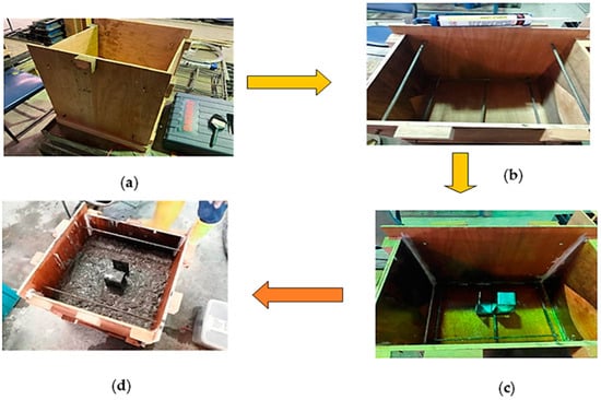 (a) Wooden mould; (b) wooden mould with pre-installed bottom wythe reinforcement; (c) position of the reinforcement and shear connector; (d) concrete for the bottom wythe.