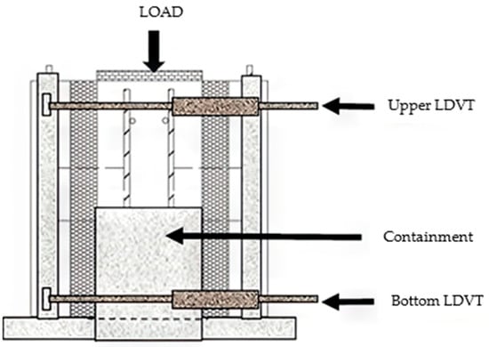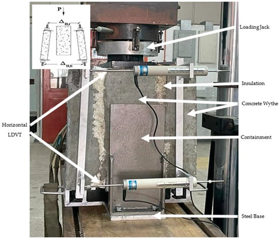 The specimens were placed on a steel pedestal and subjected to a vertical load applied by a 600 kN hydraulic jack at a 1.00 kN/min loading, resulting in a shear force acting on each SSC. The middle concrete layers had unknown torsional stiffness, which could lead to twisting around the length of the connectors, potentially reducing the in-plane shear capacity of the SSC. To counteract this, a steel containment plate was used to restrict twisting. Four different positions (top north, bottom north, top south, and bottom south) were equipped with linear variable displacement transducers (LVDTs) that encircled a PCSP sample subjected to shear loading (as depicted in Figure 6 and Figure 7). The primary objective of the LVDTs was to measure the deflection of the concrete wythes. The deflections were recorded using LVDT readings that were automatically registered.