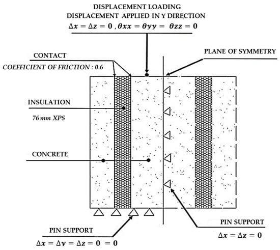 In numerical modelling, only half of the SSC specimen is simulated because it exhibits symmetry about a plane at its middle, as shown in Figure 8. The two shear connectors in the specimen have identical responses, resulting in the equal distribution of half of the uniformly distributed load (UDL) to each connector when applied to the middle concrete layer. Thus, the Abaqus model comprises a layer of insulating foam enclosed by half of the middle concrete wythe layer and an outer concrete wythe layer, as depicted in Figure 9. This approach reduces the computational time required for analysis. The contact between the concrete and steel is modelled using a surface-to-surface contact approach with a penalty algorithm. A hard contact pressure–overclosure relationship is implemented to simulate normal behaviour, allowing contact pressure transmission when the surfaces are in contact. The non-linear finite element model considers cracking and tension stiffening, the nonlinearity of concrete material under compression, and geometric nonlinearity, which arise due to geometric, material, and contact nonlinearity effects. These effects cause a non-constant stiffness matrix during load application. A contact property is established with tangential behaviour and penalty formulation, employing a friction coefficient of 0.45 for the interlayer surface contact between the concrete and steel. The interaction is based on the master–slave concept, where the S-type shear connector is modelled as the master and the concrete around it as the slave due to the higher stiffness of the steel section. Embedded region-interaction properties are not used to model the interaction between the shear connector and concrete wythes since it is unrealistic; instead, surface-to-surface interaction is employed with a defined friction coefficient. Tie constraints are used for separated concrete elements, with the slave surface being the close concrete due to its finer meshes than the far concrete.