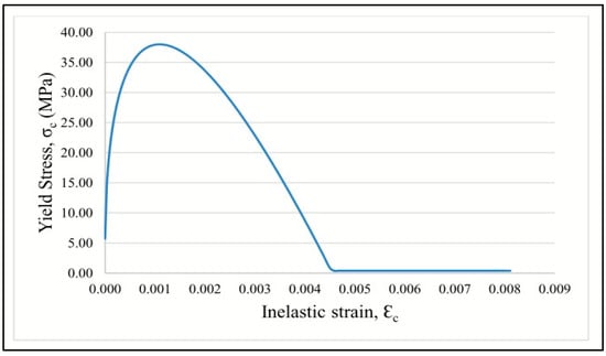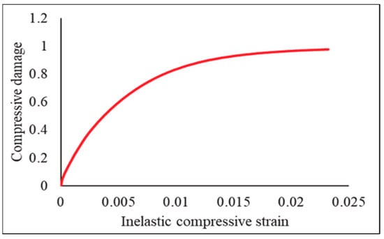 The uniaxial compressive stress–strain behaviour is used in the CDP model based on the general equation from the Abaqus 6.14 software documentation. The compressive behaviour of concrete is shown in Figure 10. This shows that the inelastic hardening strain of concrete increases until the ultimate compressive strength is reached. The brittle behaviour indicates the inelastic failure of the concrete in compression. After the maximum value, the concrete begins to be damaged. The yield stress decreases until it fails—the concrete’s damage parameter increases with increasing inelastic strain, as shown in Figure 11. The value of the damage parameter ranges from zero to one.