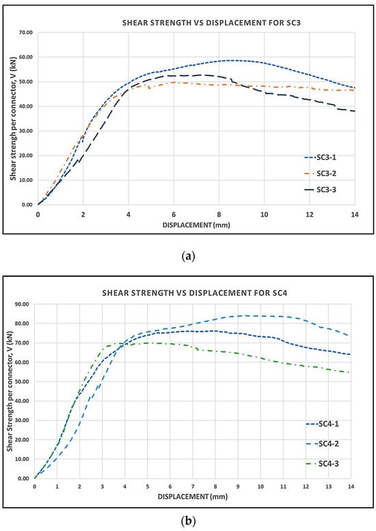 Shear strength versus displacement for SSCs. (a) SC3; (b) SC4; (c) SC6.