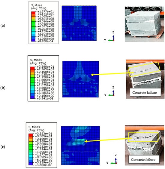 Von Mises stress developed on the outer side surface of the outer concrete layer of PCSP with S-type shear connector of width (a) 76.2 mm, (b) 101.6 mm, and (c) 152.4 mm.