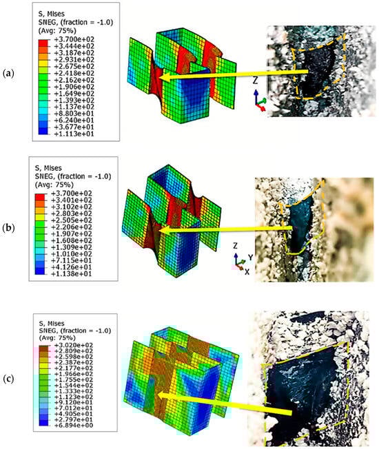Von Mises stress and shear buckling shape developed in the shear connector for (a) SC3, (b) SC4, and (c) SC6.