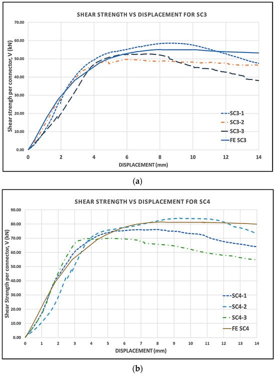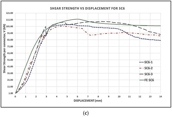 However, the load–displacement response for SC6 exhibited (Figure 22b) anomalous behaviour characterised by nonlinearity and a drop. This was attributed to the shear connector pull-out failure mode caused by the high slenderness ratio, which made the SSC more susceptible to lateral buckling under a load. It was further observed that increasing the yield strength of the steel beyond a thickness of 2 mm and a width of 101.4 mm did not improve the results and, in fact, negatively impacted the secant stiffness of the SSCs. Therefore, it is important to carefully consider the effect of the steel yield strength and geometry of the SSCs in designing and selecting suitable connectors for structural applications.