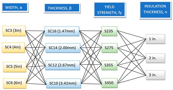Validated numerical models were used to perform a parametric analysis of the SSC to determine the influence of the width and thickness of the SSC on its shear behaviour, which was then confirmed. Figure 19 contains the matrix used for these parametric studies. The models are designated as SCα-β-fy-n, where α is the width of the connector in inches, β is the gauge number of the steel sheet, fy is the strength of the steel plate yield, and n is the thickness in inches. The thickness and width of the connections range from 1.47 to 3.42 mm and 76.2 to 152 mm, respectively. The SSC was assigned steel characteristics with a connector yield strength ranging from 235 MPa to 450 MPa to perform the parametric analysis on this connector. This parametric investigation also considered the insulating thicknesses of 1, 2, and 3 inches.