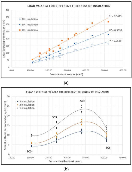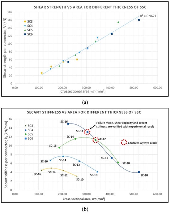 (a) Shear strength versus area and (b) secant stiffness versus area for different thicknesses of the SSC.