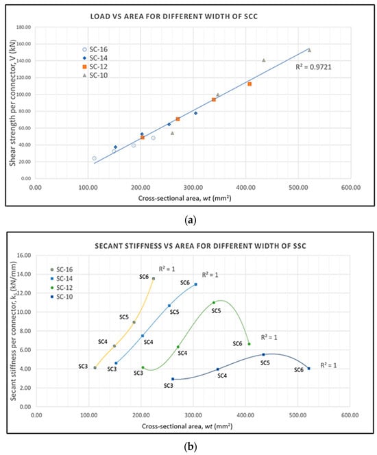 (a) Shear strength versus area and (b) secant stiffness versus area for different widths of SSC.