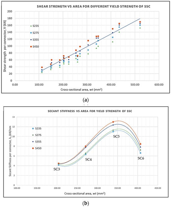 (a) Shear strength versus area and (b) secant stiffness versus area for different yield strengths of the SSC.