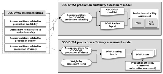 The OSC-DfMA integrated assessment model is composed of two detailed models: the OSC-DfMA production suitability assessment model and the OSC-DfMA production efficiency assessment model, as shown in Figure 1. First, the OSC-DfMA production suitability assessment model is an assessment model that evaluates the DfMA conformity of a design by evaluating whether and what items related to production availability, production safety, and production quality are reflected among the OSC-DfMA assessment items. The OSC-DfMA production suitability assessment model supports designers in self-reviewing their own designs by utilizing the DfMA checklist for DfMA conformity after design completion and contributes to improving the reliability of the design by creating a detailed assessment of each item as a DfMA review report and submitting it to the assessor. Additionally, the OSC-DfMA production efficiency assessment model evaluates the degree of DfMA reflection in a design using items related to production efficiency among OSC-DfMA assessment items. The OSC-DfMA production efficiency assessment is used to derive the optimal design plan by comparing alternatives based on OSC-DfMA production efficiency assessment items when multiple design plans exist through the combination and division of modules.