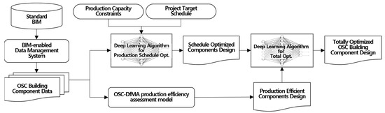 In a broad sense, the proposed OSC-DfMA assessment model is a kind of design optimization process focused on the production efficiency of building components and relies on design information. The main points of design optimization in the models are viewed from the efficiencies of manufacturing, delivering, assembling, and maintaining building components. This approach is very useful and provides significant information for decision-making during the design phase. However, when it comes to production planning, for the proposed OSC-DfMA assessment model to be more practical, it is important to consider both production efficiency and capacity. This is because production capacity affects the production schedule, which in turn affects the entire project schedule and cost. Furthermore, we need to consider how the entire assessment process can be automated, given the large amount of data handled through the production efficiency and capacity assessment process. In this regard, we propose a conceptual model for OSC-DfMA optimization and automation, which incorporates the proposed OSC-DfMA assessment model, a deep learning model for optimizing the manufacturing–delivering–assembling schedule based on production efficiency and capacity, and a BIM-based data management automation model as follows (refer to Figure 5).