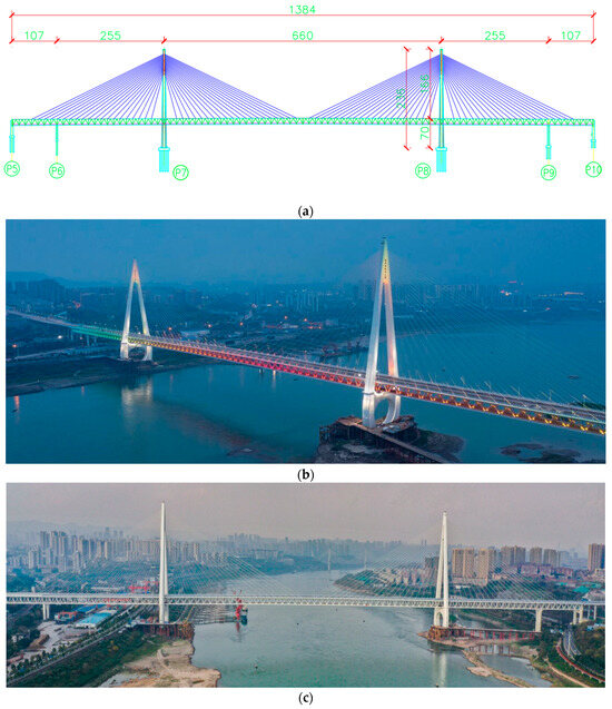 Bridge Overview: (a) Layout of the long-span dual-purpose highway-rail double-tower cable-stayed bridge; (b) in situ photo of Baijusi Yangtze bridge; (c) in situ elevation of Baijusi Yangtze bridge.