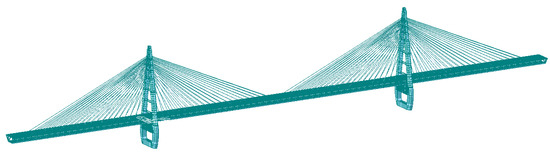 Midas Civil has highly developed modeling and analysis capabilities that allow for accurate modeling to visualize the effects of parameter changes on properties. Therefore, in this study, the finite element model of the bridge was developed using the finite element software MidasCivil 2022 v1.2. To ensure coherence between the model and the actual construction, we used space truss elements to replicate the steel truss beams. Due to its unique shape, we simulated the pylon using a multi-variable cross-section group. To achieve a more uniform and symmetrical distribution of forces on the tension cables that connect the two pylons, we chose truss elements instead of pure tensile elements. Ernst’s formula was used to adjust the modulus of elasticity of the cables, aligning them with their actual nonlinear characteristics. The materials used in the finite element model are consistent with the actual bridge conditions to ensure the accuracy and reliability of the structural analysis. The plate element represents the orthotropic bridge panel in the simulation. The dead weight is determined by the quantities of steel and concrete used in the actual construction, considering the impact of the bridge’s phase II load. Elastic connections are established between the pylon and steel truss beam, as well as between the auxiliary pier and steel truss beam, depending on the engineering requirements. The right pylon’s bottom is fixed, while the other piers have hinged connections. A comprehensive analysis of the bridge’s dynamic properties was conducted after constructing the model. Table 1 displays the bridge’s material parameters, and Figure 2 depicts the Midas Civil model.