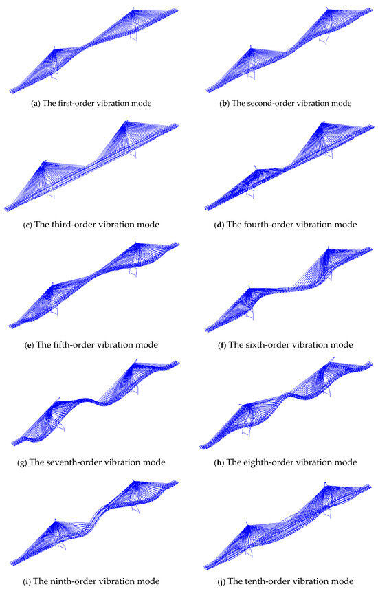 The frequency spectrum of the cable-stayed bridge is denser compared to a conventional cable-stayed bridge due to its extensive main span. To enable the load to have more vibration modes within the frequency range, the dynamic properties of this cable-stayed bridge were analyzed using the tenth-order mode. The characteristics of the bridge structure are typically assessed using the undamped free vibration equation, which takes into account the initial stress effects caused by dead weight. In a vertical plane, the deadweight of each location equals the mass of the overlying unit area. To compute the frequency and mode shapes, the subspace iteration method [24,25,26,27] is utilized. Table 2 shows the characteristics of the natural frequency, the period, and the mode shapes of the first 10 modes of the bridge, while Figure 3 illustrates some of the mode shapes.