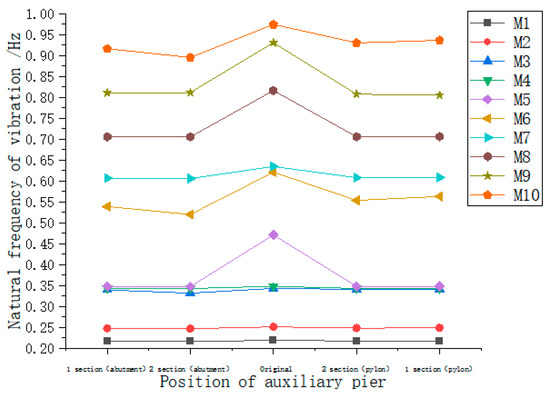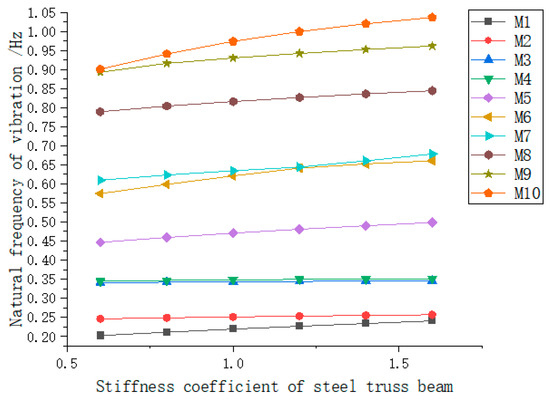 Changes in the frequency parameters of a bridge structure can directly affect the overall structural integrity of the bridge. Such changes may further affect the force state and force transmission path of the bridge and may even lead to structural instability or damage. Secondly, changes in the frequency parameters of bridge structures have a significant effect on the dynamic responses of bridges. Changes in frequency parameters will change the vibration characteristics and response modes of the bridge. This may not only affect the usability and comfort of the bridge but also pose a threat to the structural safety of the bridge. To analyze the influence of the changes in structural parameters on the dynamical properties of the bridge, the rigidity of the steel truss, the rigidity of the cable, the stiffness of the pylon, and the position of the auxiliary pier have changed now [28,29,30,31,32,33,34,35,36,37,38]. For the convenience of illustration, the first 10 order modes of the bridge are numbered as M1~M10. It is important to note that the investigation of the pattern of change in the dynamic properties of the bridge by varying the stiffness of the steel truss beams, cables, and bridge pylons is conducted with the known frequency content of the seismic and wind dynamic inputs expected at the site, and the resulting new natural frequencies should be compared to the known excitation frequencies.