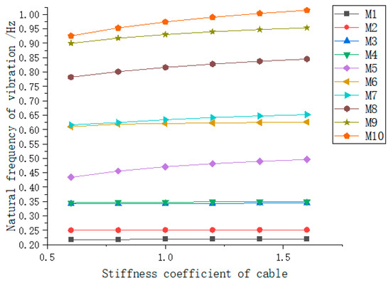 As can be observed in the figure, the bridge frequency shows an upward trend as the cable rigidity increases, but it is worth noting that the frequency change in each mode is relatively small. Among the bending modes, the fifth order (M5) has the largest frequency increase rate, which is 14.29%, but the frequency appreciation is very small and is only 0.06 Hz. The revaluation of the eighth-order mode (M8) is the largest at the frequency of 0.06 Hz, which is only 0.01 Hz higher than that of the fifth-order mode. The frequency increase rates of the first-order mode (M1) and the second-order mode (M2) are 1.21% and 0.66%, respectively, which means that the feedback obtained by improving the cable stiffness is small for both the transverse and vertical bending resistance of the bridge. In the bending–torsional coupling mode, the frequency increase rate of the tenth-order mode (M10) is 9.59%, and the frequency appreciation reaches 0.09 Hz. In general, with the improvement in cable rigidity, the frequency values of the whole tenth-order mode increase slightly, and the average growth rate is only 5%, which means that with improvement in cable rigidity, improvement in the bending resistance and bending coupling performance of the bridge structure is weak. Therefore, in the process of bridge design and structure, if the dynamic characteristics of bridges need to be improved, the priority of improving cable stiffness is low.