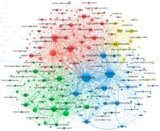 Many associated keywords demonstrate clustered research-themed connections when focusing on the latest research regarding bacterial self-healing concretes. The following bibliometric network, provided by VOSviewer [