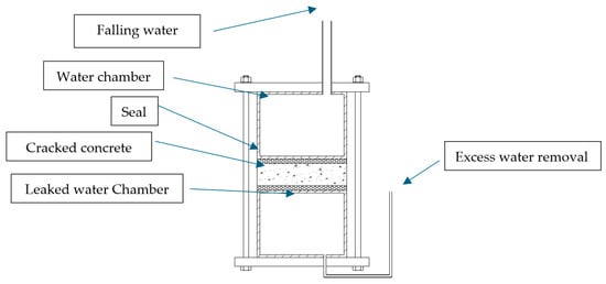 Figure 6, the following materials are required: a cubic specimen with a completely penetrated interface, a cylindrical PVC tube measuring 60 mm in diameter and 15 to 30 mm in height, a rubber membrane measuring 60 × 80 mm and 0.2 mm in thickness featuring a circular opening, a rubber disc with a diameter of 160 mm and a thickness of 10 mm equipped with an internal circular opening, a support structure to hold the specimen in place, a flask or jug for water collection, and a graduated cylinder for precise volume measurement. A flow regulator is adjusted to deliver water at 0.069 mL/s or 4.16 mL/min, ensuring a total water volume of 83.2 ml over 20 min. A hot glue gun and sticks seal any lateral cracks in the specimen.