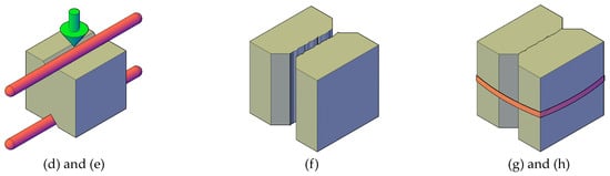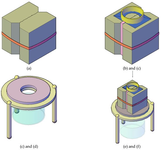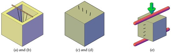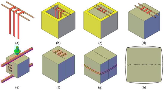The next phase involves the application of force, which is administered perpendicularly to the longitudinal alignment of the embedded steel strips. This force is gradually applied using a hydraulic jack equipped with steel rods (e). Following the splitting of the specimen, the surface interface is meticulously cleaned of any debris, and the plates are removed. This process facilitates the closure of the interface while ensuring the steel opening remains fully accessible (f).