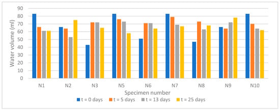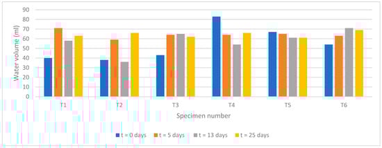 Figure 19 provide a detailed quantitative analysis of water permeability through the cracks over time, offering a basis for calculating the percentage of healing at the following various intervals: Day 0, Day 5, Day 13, and Day 25.