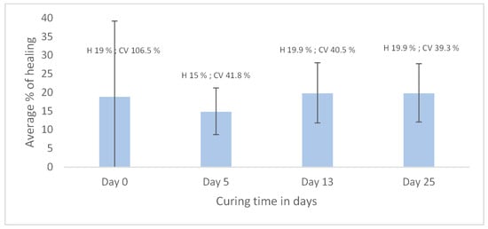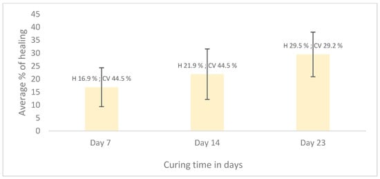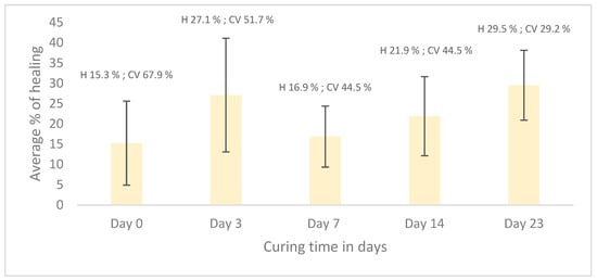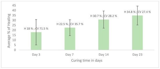 It is assumed that the initial healing at 0 days (15 min after cracking) and its high value of CV is due to the rehydration of the cement particles, retaining water in the interface, and thus, not an effect of the healing agent added to the concrete.