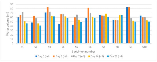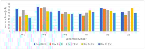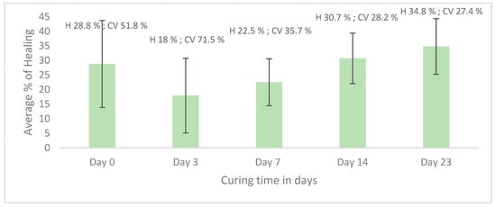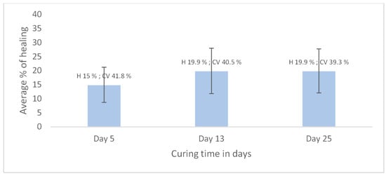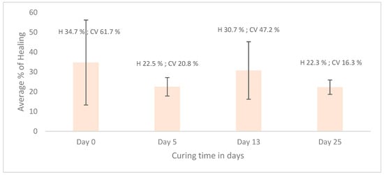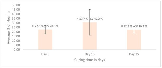 Figure 8 include the average amount of water passed, the maximum and minimum values, and the standard deviation, which provide insight into the variability and reliability of the data. Interestingly, the average percentage of healing initially decreases from 19.0% on Day 0 to 15.0% on Day 5, then fluctuates slightly higher to 19.9% by Day 13 and remains the same by Day 25. The average healing percentage does not show a significant increase over the 25 days, which could suggest a slower or less pronounced healing process compared with earlier methods. The standard deviation values, which are relatively high across all days, indicate considerable variability in the healing performance among the specimens.