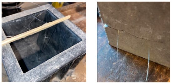 Following mould preparation, the fresh concrete mix is poured into the moulds, with particular care taken to maintain the tension of the nylon strings, ensuring their correct positioning (b). The specimens are then left to cure for 24 h, a period that varies depending on the specific mechanical properties of the concrete mix. Once the initial curing phase concludes, the strings are cut at the points of attachment to the strips yet remain embedded within the concrete, marking the commencement of the controlled cracking process (c and d).