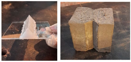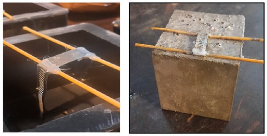 Figure 5a depicts. After allowing adequate time for the adhesive to set, the strips are placed into the previously prepared concrete mould (b). Subsequently, fresh concrete, enhanced with a self-healing agent, is poured into the mould. It is crucial to ensure the plates are correctly aligned during this process. The newly formed specimen is then vibrated and left to air dry (c).