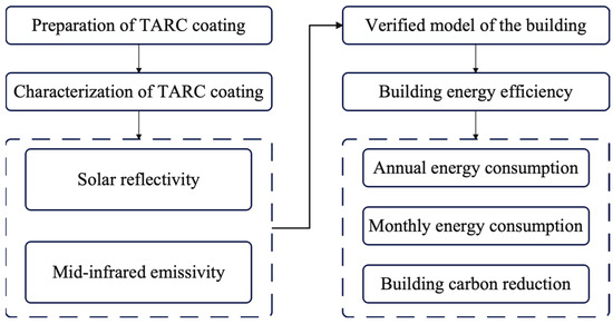 To develop a TARC material with simple preparation, cost effectiveness, and large-scale application that can be widely used for improving building energy efficiency, this paper proposes a TARC coating based on a thermochromic powder. The process of preparing the proposed TARC coating was briefly introduced, and the performance parameters of the TARC coating (e.g., solar reflectivity and mid-infrared emissivity) were measured. Then, the heat transfer on the surface of the TARC coating was analyzed. Based on the measured performance parameters of the TARC coating, a typical two-story residential building with a roof area of 258.43 m2 was modeled using EnergyPlus. Finally, the energy performance of applying the proposed TARC coating in buildings under different climates in China was discussed in detail. The flowchart of this study is shown in Figure 1.