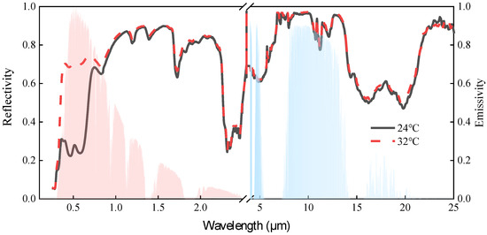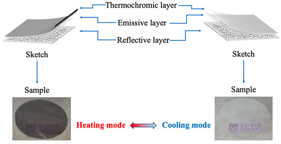 As shown in Figure 2, the TARC coating appears transparent when the surface temperature is higher than the phase transition temperature. The TARC coating has high reflectivity in the solar spectrum and mid-infrared emissivity in this state. This also means that the TARC coating works in a cooling mode, reflecting solar irradiance while also exchanging heat with outer space through the transparent window to obtain cooling energy, thereby achieving sub-ambient radiative cooling. However, the TARC coating works in heating mode once the surface temperature is lower than the phase change temperature (25 °C), and it changes to a semitransparent coating with high solar absorptivity. This increases the absorption of solar irradiance and achieves heat collection.