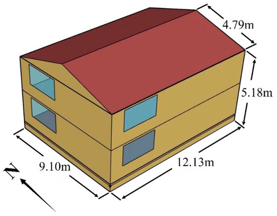 To derive the energy efficiency potential for the application of the proposed TARC coating in buildings, a typical two-story residential building originating from the U.S. Department of Energy (DOE) building energy codes program [30] is adopted in this study. As shown in Figure 4, the modeled building with a roof area of 258.43 m2 has dimensions of 12.13 m (length) × 9.10 m (width) × 5.79 m (height). A TARC coating/passive daytime radiative cooling (PDRC) coating is directly laid on the original roof (AS roof) to serve as the TARC roof/PDRC roof, and a split air conditioner is configured to supply supplemental cooling/heating to the building during the cooling/heating season. For the application of the TARC roof, the cooling and heating modes change adaptively with the roof surface temperature. Furthermore, other parameters of the modeled typical residential building can be found in Table 1.