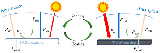 The heat transfer of the TARC coating is shown in Figure 5, which includes the thermal radiation from the TARC coating (Prad). the absorbed atmospheric radiation of the TARC coating (Patm), the absorbed solar irradiance of the TARC coating (Psun), the convection heat transfer between the TARC coating surface and the ambient air (Pconv), and the conduction heat transfer through the TARC coating (Pcond).