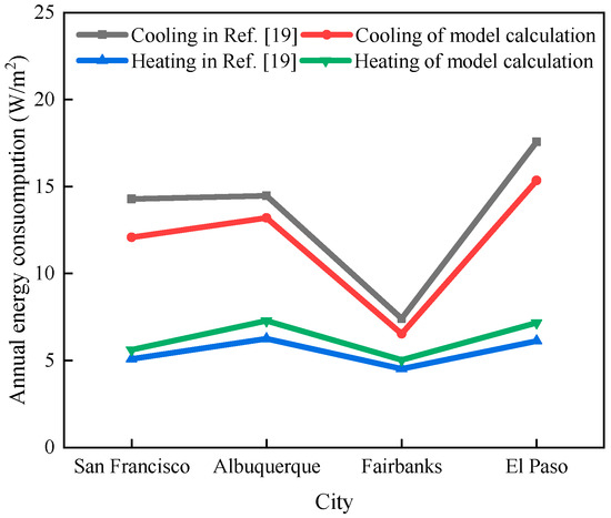 To ensure the accuracy, the data in Ref. [19] are adopted to verify the model. Although the TARC coating used in Ref. [19] is a VO2-based coating, the building in this study is the same as that in Ref. [19]. Therefore, the only work that needs to be carried out is to modify the properties (i.e., solar reflectivity and mid-infrared emissivity) of the TARC coating in this study to the same parameters as in Ref. [19]. This modification involves only the configuration of the emissivity and reflectivity of the TARC material. Thus, the accuracy of the model can be verified with the work in Ref. [19]. As shown in Figure 6, the relative error between the calculated annual cooling/heating energy consumption and the results in Ref. [19] is lower than 12%/17% for different cities in the U.S., which indicates that the established model can be used in the following study.