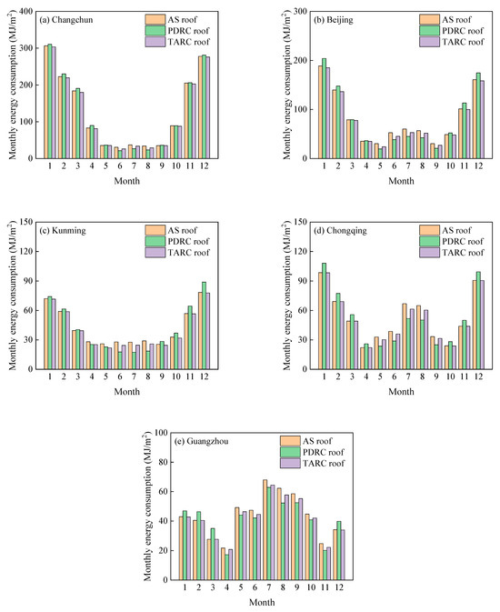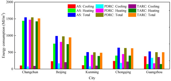 To determine the energy-saving potential of applying TARC roofs to buildings, the energy consumption of buildings with TARC roofs is compared to that of buildings with AS roofs and PDRC roofs. A comparison of the energy consumption for buildings with the abovementioned roofs is shown in Figure 7.