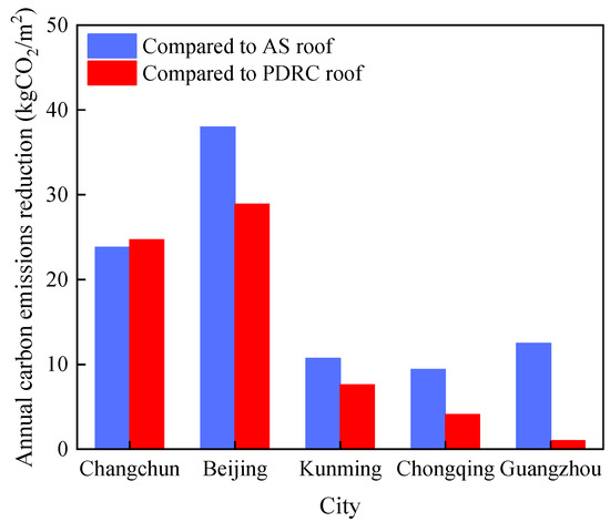 As shown in Figure 9, the annual carbon emissions reductions caused by applying the TARC roof are 23.8 kgCO2/m2 in Changchun, 38.0 kgCO2/m2 in Beijing, 10.7 kgCO2/m2 in Kunming, 9.4 kgCO2/m2 in Chongqing, and 12.5 kgCO2/m2 in Guangzhou compared to those caused by applying the AS roof. Furthermore, the annual carbon emissions of applying TARC roofs decreased by 24.7 kgCO2/m2 in Changchun, 28.9 kgCO2/m2 in Beijing, 7.6 kgCO2/m2 in Kunming, 4.1 kgCO2/m2 in Chongqing, and 1.0 kgCO2/m2 in Guangzhou in this model.