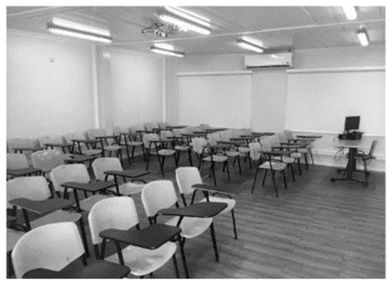 The AC system in the building is split type one, with 36,000 BTU/h units in each classroom. The temperature is set at 20 °C, and they are kept running continuously from Monday to Saturday, during working hours, from 6:30 a.m. to 9:30 p.m. Figure 2 shows a picture of the classrooms with split units installed.