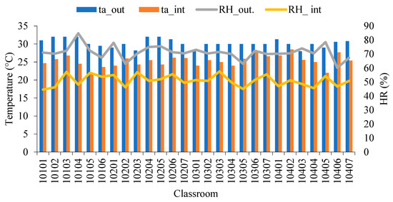 The average results by classroom are shown in Figure 3. The relative humidity variation between the indoor and outdoor environment is approximately 4.9% to 20%, respectively. From the measurements carried out in all classrooms, an average RH_in of 51% and a T_in of 25.3 °C were obtained for the entire building. Additionally, continuous measurements of these parameters were monitored simultaneously to electricity consumption measurements per floor. Monitored data have been used to calibrate the simulated model by DesignBuilder software and validate the predictions of electricity consumption.