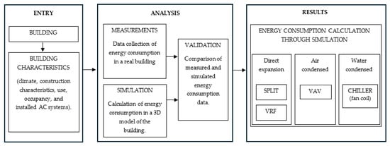 Figure 4 shows how the energy consumption of the building has been determined. Input data such as climate and the characteristics of the educational building were taken into account to calculate the energy consumption for each AC system in the first stage. In the second stage, measurements were made in the real building, and the 3D model of the building was developed to carry out energy simulation. The results obtained from measurements and simulations are compared to validate the model. The third stage is developed with the validated building model, where the energy consumption values for each AC technology (Split, VRF, VAV, Chiller) are obtained.